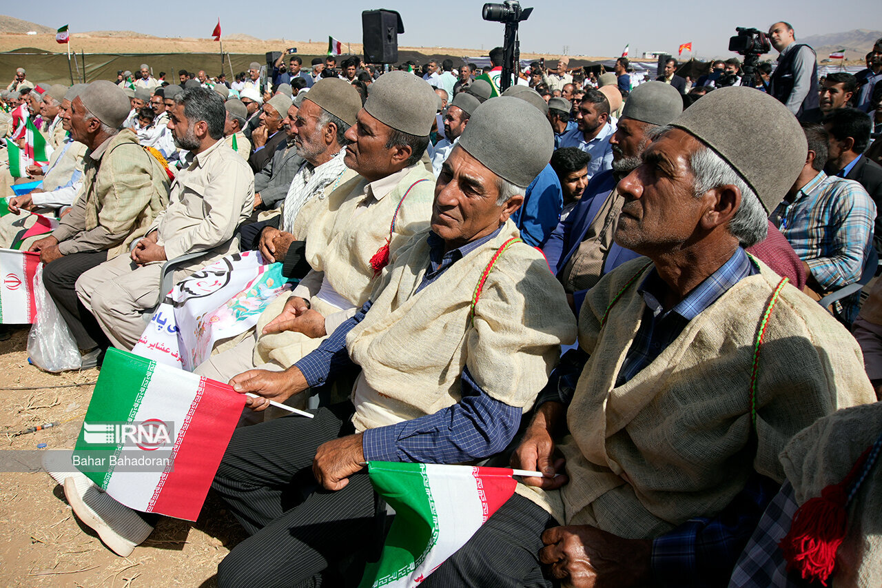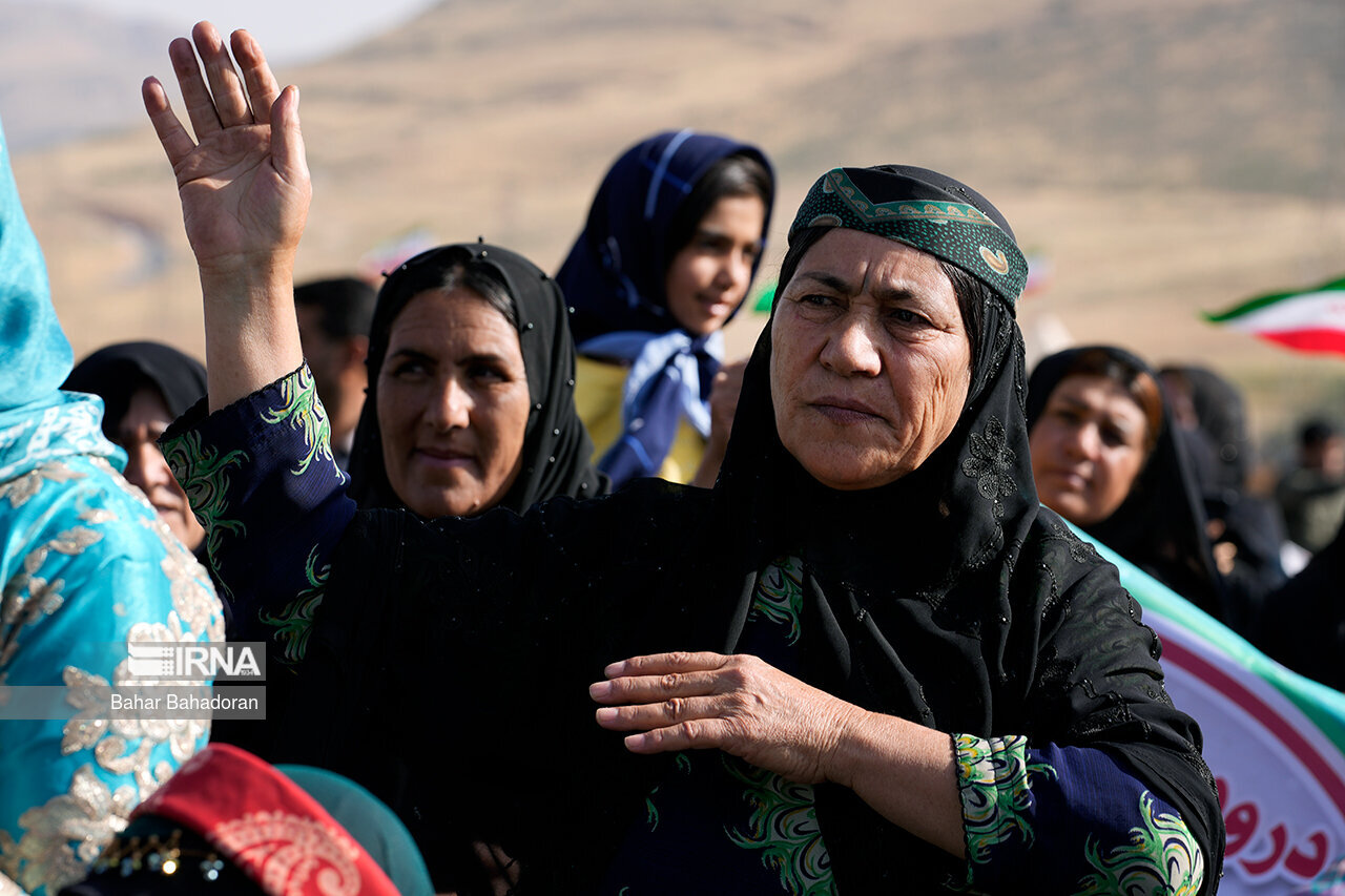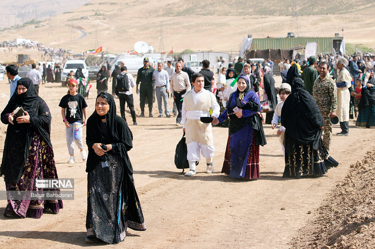 عشایرنشینان در حالی که لباس های محلی به تن دارند و موسیقی سنتی نیز در حال نواختن است با شعار «خش اومی شاد اومی پات من تیم» ( خوش آمدی،شاد آمدی پاهات بر روی چشمان) از رئیس جمهور استقبال کردند.