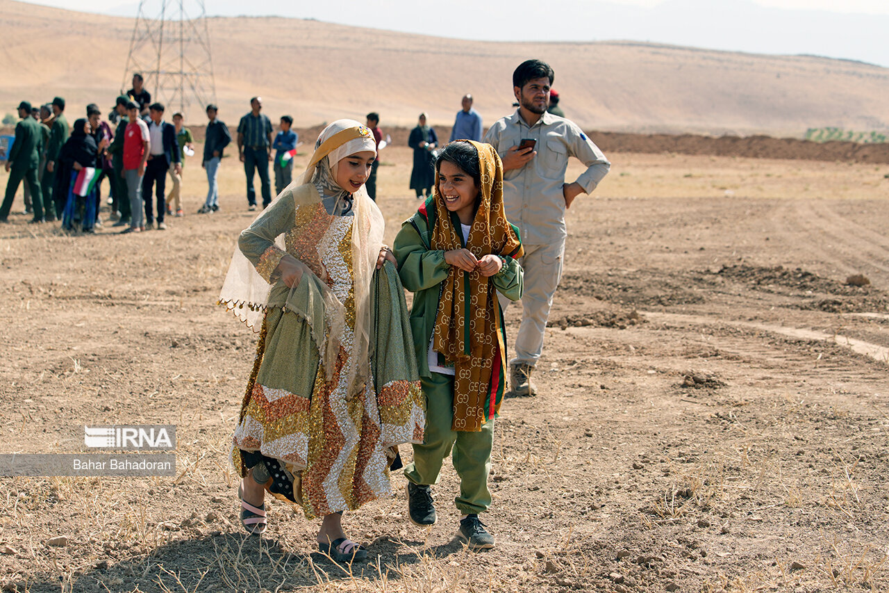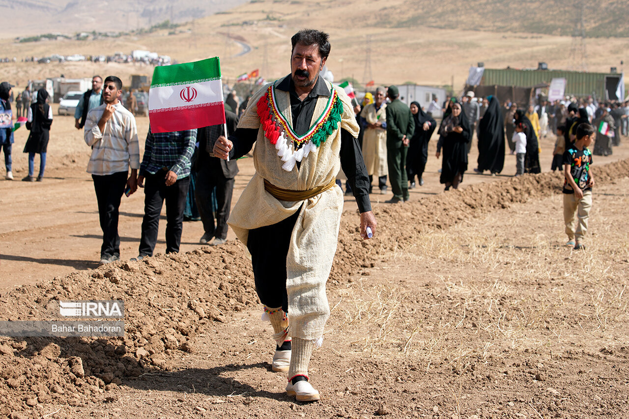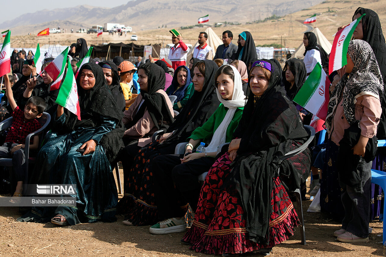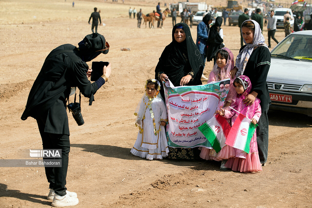 عشایرنشینان در حالی که لباس های محلی به تن دارند و موسیقی سنتی نیز در حال نواختن است با شعار «خش اومی شاد اومی پات من تیم» ( خوش آمدی،شاد آمدی پاهات بر روی چشمان) از رئیس جمهور استقبال کردند.