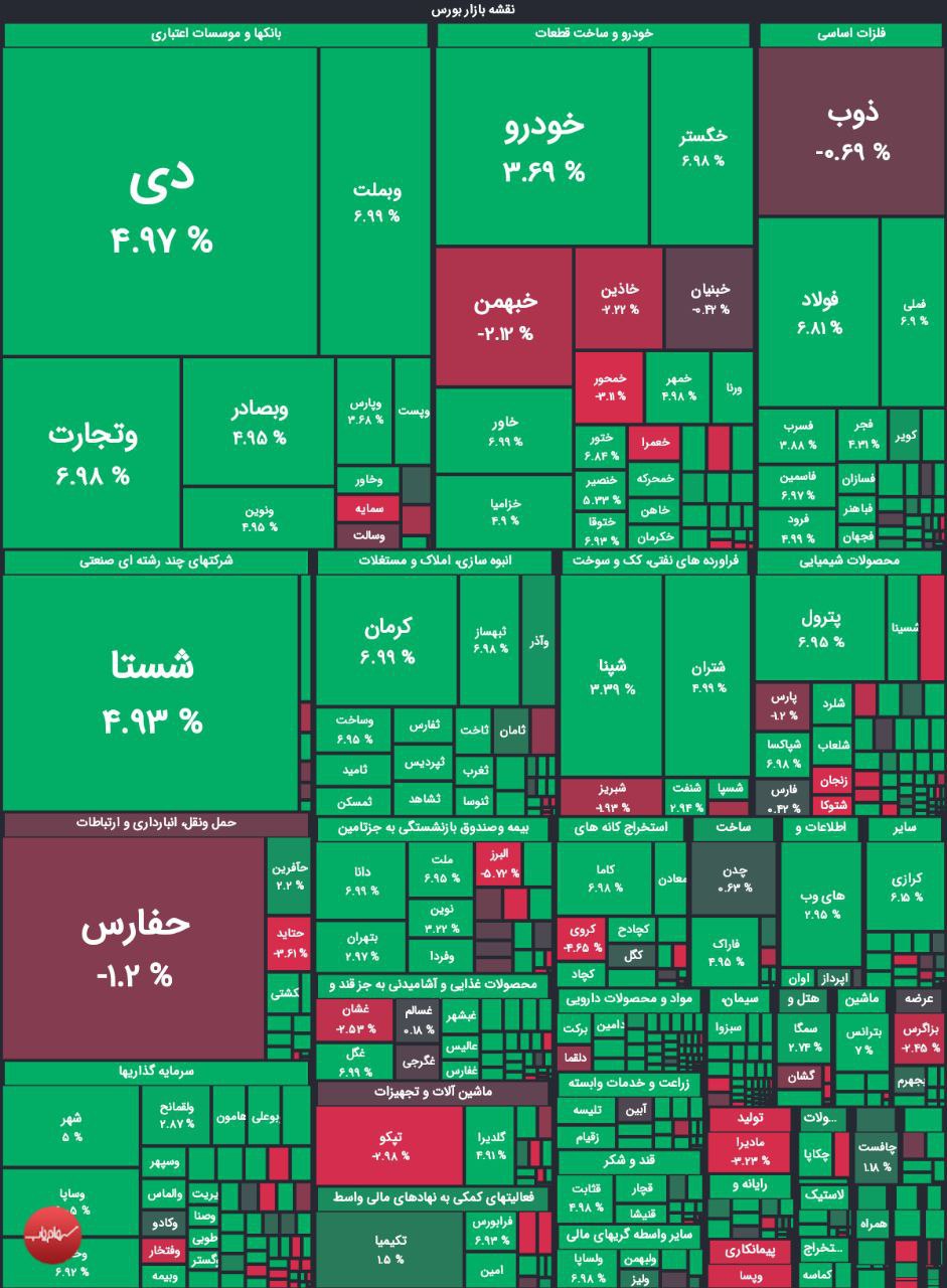 به گزارش سایت طلا،شاخص کل بورس امروز با ۴۳ هزار و ۱۲۲ واحد صعود تا رقم یک میلیون و ۹۹۹ هزار واحد افزایش یافت. شاخص کل با معیار هم‌وزن نیز ۱۵ هزار و ۴۹۸ واحد صعود کرد و در رقم ۷۰۳ هزار و ۲۵۱ واحد ایستاد. در این بازار ۴۳۰ هزار معامله به ارزش ۷۱ هزار و ۵۷۴ میلیارد ریال انجام شد. طی معاملات امروز ۸۴ درصد نمادهای بورسی مثبت بودند که از میان آن‌ها فولاد مبارکه اصفهان، ملی صنایع مس ایران و سرمایه‌گذاری تامین اجتماعی نسبت به سایر نمادها بیشترین تاثیر مثبت را روی بورس گذاشتند.
