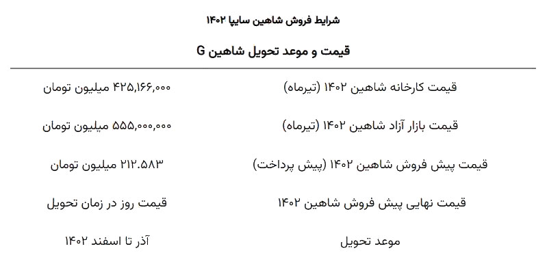 گروه خودروسازی سایپا، شاهین ۱۴۰۲ را در قالب طرح پیش فروش عرضه کرده است. به این صورت که متقاضیان برای شرکت در پیش فروش سایپا باید نصف مبلغ را بپردازند که حوالی ۲۱۲ میلیون تومان اعلام شده است و قیمت نهایی شاهین آذر-اسفند سال جاری اعلام خواهد شد.