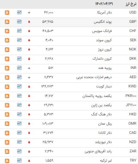 بانک مرکزی امروز نرخ هر دلار را ۴۲ هزار ریال، پوند را ۵۳ هزار و ۹۷۵ ریال و یورو را ۴۶ هزار و ۶۹۷ ریال اعلام کرد.