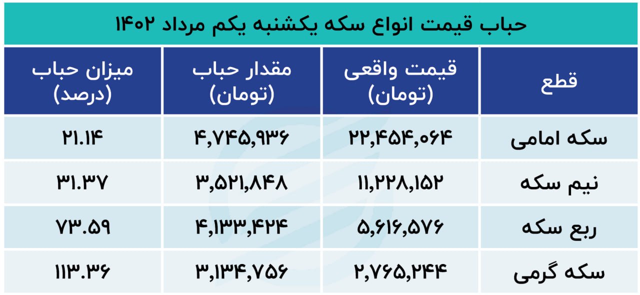 قیمت واقعی سکه امامی در شرایط فعلی ۲۲ میلیون و ۴۵۴ هزار تومان است. حباب سکه هم ۴ میلیون و ۷۴۵ هزار تومان بدست آمد.