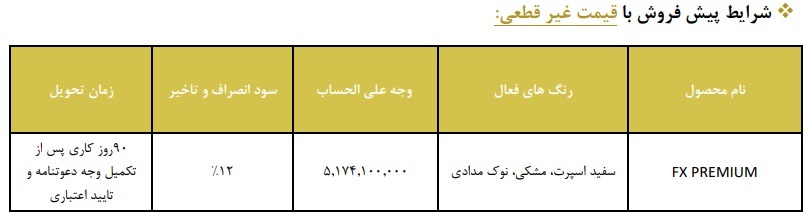 کلیه منتخبین دومین دوره ثبت نام در سامانه یکپارچه فروش خودرو با موعد تحویل تابستان 1402 که کد ملی ایشان در سامانه مذکور اعلام گردیده است، با توجه به موجود بودن خودروی PREMIUM FX میتوانند از تاریخ 1402/05/01 لغایت 1402/05/07 با مراجعه به یکی از نمایندگی های مجاز شرکت مدیران خودرو نسبت به تغییر خودرو و تکمیل فرآیند ثبت نام خود مطابق شرایط زیر اقدام نمایند.