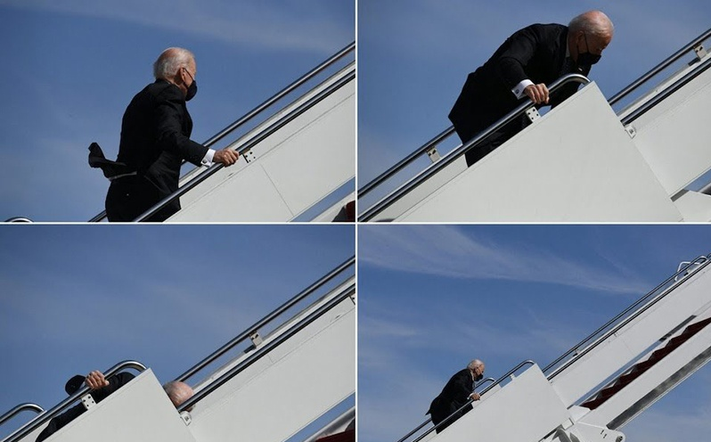 اما از آغاز ریاستجمهوری بایدن لغزشهای کلامی و رفتاری او که از آن به گاف تعبیر میشود، شتاب بیشتری گرفت و در مارس ۲۰۲۱ دو ماه بعد از ورود به کاخ سفید، رئیسجمهور آمریکا سه بار هنگام بالا رفتن از پلههای «ایر فورس وان» (هواپیمای مخصوص ریاستجمهوری آمریکا) زمین خورد.