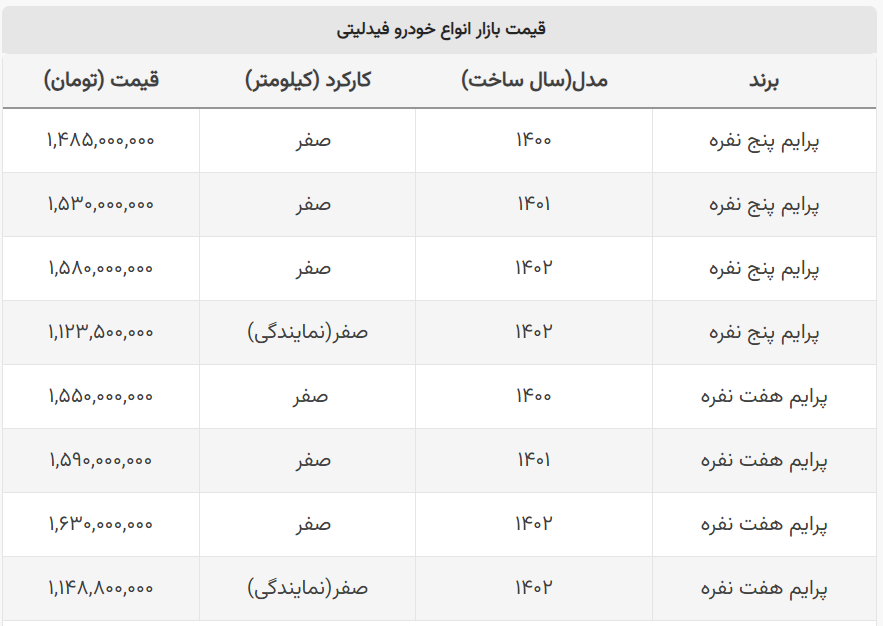 قیمت خودروهای فیدلیتی در بازار کاهش یافت بر این اساس فیدلتی ۷ نفره مدل ۱۴۰۲ در بازار ۱۲۰ میلیون تومان ارزان شد مدل ۱۴۰۱ کاهش ۹۰ میلیونی داشت و قیمت مدل ۱۴۰۰ نیز ۷۰ میلیون تومان افت کرد همچنین قیمت فیدلتی پرایم ۵ نفره مدل ۱۴۰۲ در بازار ۱۰۰ میلیون تومان ارزان شد مدل ۱۴۰۱ هم کاهش ۱۰۰ میلیونی داشت و مدل ۱۴۰۰ با افت ۶۵ میلیونی به زیر ۱ میلیارد و نیم رسید.