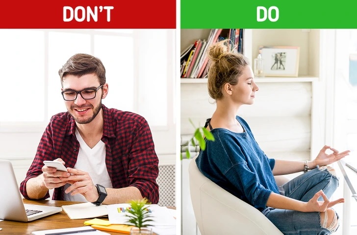 داشتن استراحت به طور منظم در حین کار برای افزایش خلاقیت و تمرکز ضروری است. با این حال، نحوه ی استفاده از این زمان های استراحت هم مهم است. به جای خیره شدن به تلفن همراه خود، سعی کنید فعالیتی انجام دهید که فکرتان را از کار دور کند. کارهایی مانند قدم زدن یا انجام مدیتیشن به شما کمک می کند تجدید قوا کنید و آرام بگیرید.