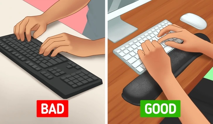 خستگی و درد مچ دست ها که بر اثر تایپ زیاد با کیبورد به وجود می آید را شاید بتوان با استفاده از پدهای استراحت مچ دست که مخصوص کیبورد هستند، کاهش داد. این پدها انواع مختلفی دارند و کار آن ها صاف نگه داشتن مچ دست ها هنگام تایپ با کیبورد است. با این کار، فشار کمتری به ماهیچه های ساعد دست وارد می شود که در نتیجه ی آن فشار به کل دست کاهش می یابد.