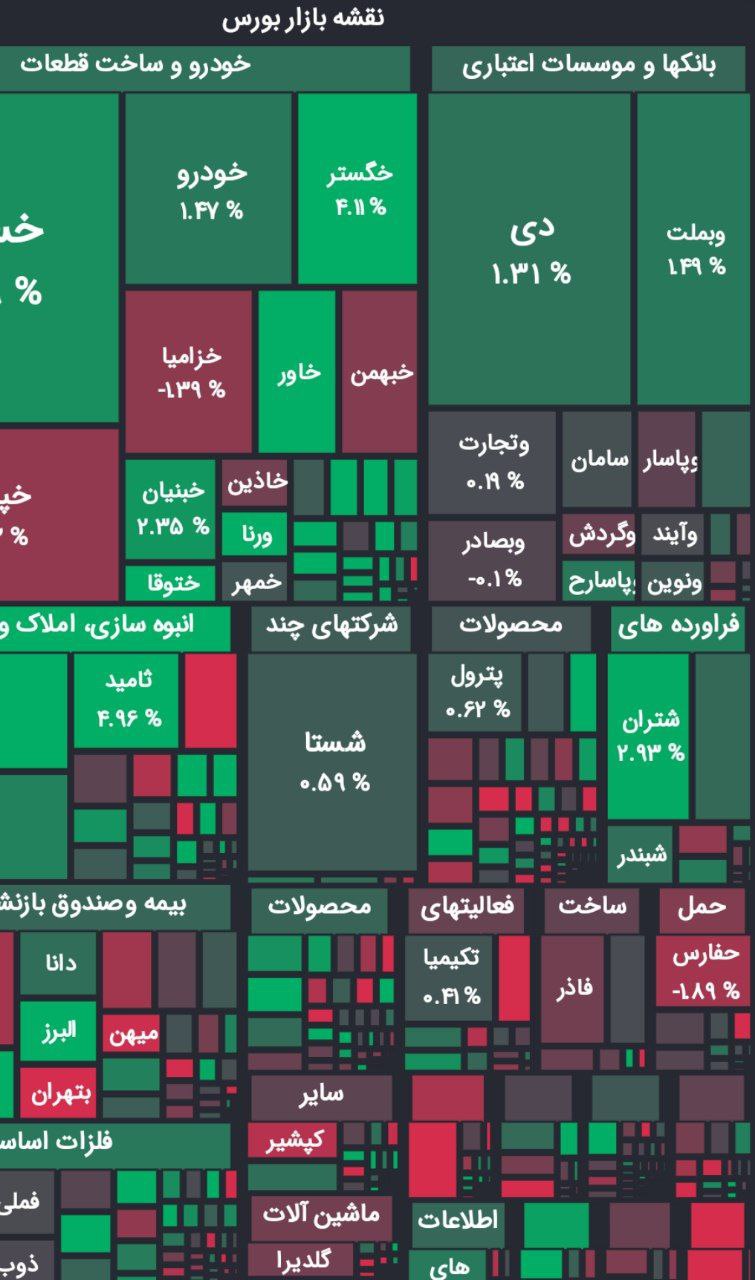 شاخص کل هم وزن با رشد هزار و ۷۷۷ واحدی روی پله ۶۹۹ هزار و ۱۶۱ واحدی قرار گرفت.همچنین حجم معاملات امروز سهام در بورس تهران به تعداد ۴ هزار و ۷۰ میلیارد سهم به ارزش ۲ هزار و ۴۸۸ هزارمیلیارد تومان رسید. شاخص فرابورس هم با رشد ۵۸ واحدی روی پله ۲۶ هزار و ۲۰ واحدی ایستاد.