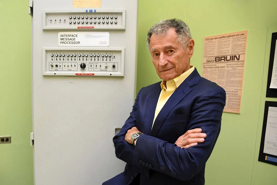 لئونارد کلاین‌راک در کنار نخستین پردازشگر پیام رابط (IMP) در آزمایشگاهی که نخستین پیام اینترنتی در آن ارسال شد در دانشگاه کالیفرنیا لس آنجلس ژست گرفته است.