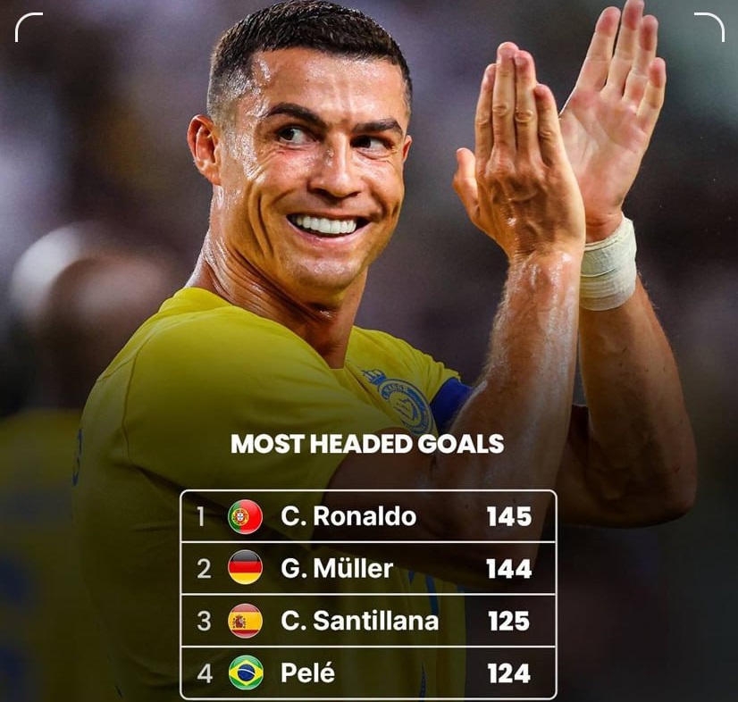 کریستیانو رونالدو با گلزنی در بازی شب گذشته با ضربه سر، رکورددار بیشترین گل‌زده با ضربه سر در تاریخ مسابقات رسمی فوتبال شد و از «گرد مولر» عبور کرد.