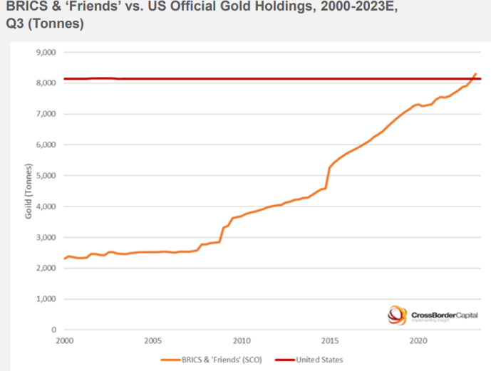 این تحلیلگران معتقدند که ذخایر طلای اعضای فعلی بریکس یعنی برزیل، روسیه، هند، چین و آفریقای جنوبی، به انضمام ذخایر بیش از ۴۰ کشوری که برای پیوستن به این بلوک اقتصادی ابراز علاقه کردهاند، ممکن است تا پایان سال جاری میلادی از ذخایر طلای آمریکا پیشی بگیرد؛ البته اگر تا کنون این اتفاق نیفتاده باشد.