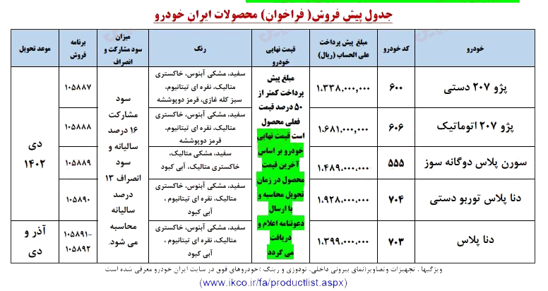 در طرح پیش فروش ایران خودرو پژو ۲۰۷ دستی، پژو ۲۰۷ توماتیک، سمند سورن پلاس دوگانه سوز، دنا پلاس توربو دستی و دنا پلاس عرضه شده است. موعد تحویل نیز دی و آذرماه سال جاری است.