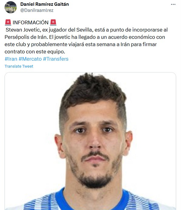این خبرنگار اسپانیایی که برای رسانه UF مینویسد در صفحه توییتری خود نوشت: استفن یووتیچ، بازیکن سابق سویا در حال پیوستن به باشگاه پرسپولیس ایران است. او با باشگاه ایرانی بر سر مسائل مالی به توافق رسید و احتمال این هفته به ایران سفر کند تا قرارداد خود را امضا کند.