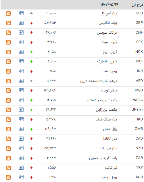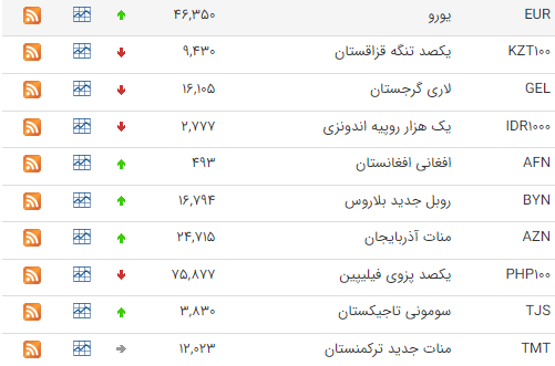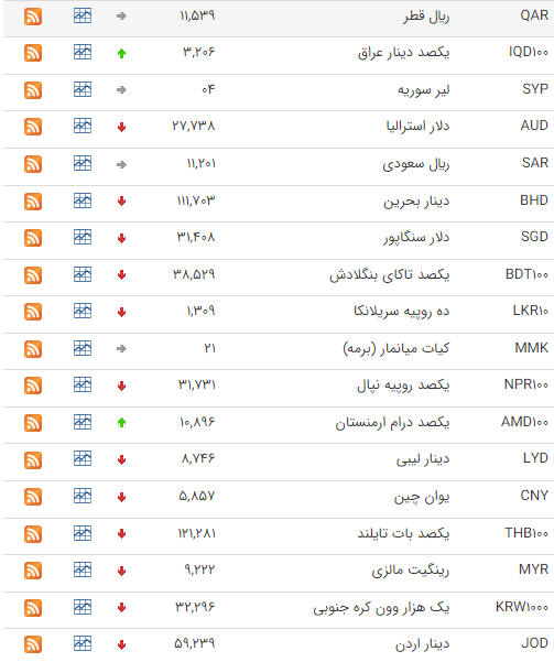 بر این اساس نرخ یورو، افغانی افغانستان، یکصد ین ژاپن و یکصد دینار عراق افزایش و نرخ پوند انگلیس، دلار کانادا، دلار استرالیا، یوان چین و لیر ترکیه کاهش یافت.