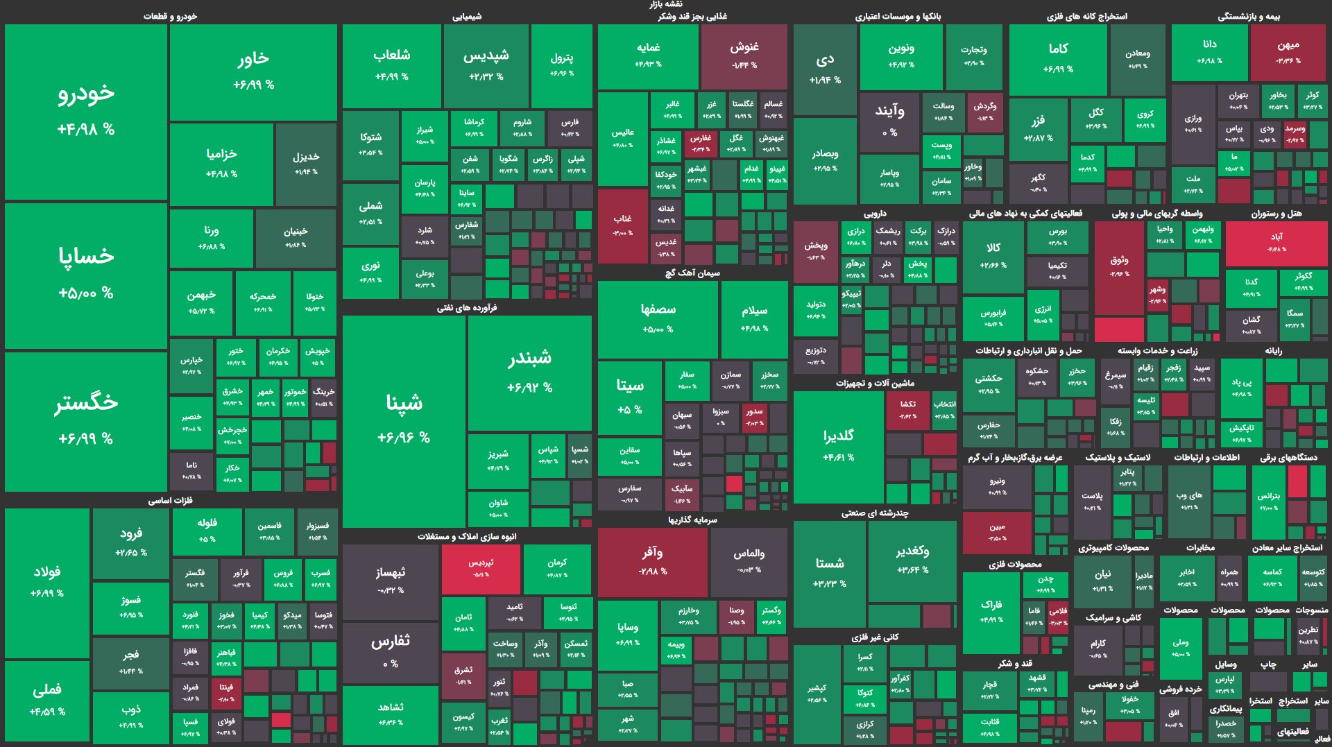 ۸۲ درصد نمادهای بورسی مثبت بودند که از میان آنها فولاد مبارکه اصفهان، ملی صنایع مس ایران و پالایش نفت اصفهان نسبت به سایر نمادها بیشترین تاثیر مثبت را روی بورس گذاشتند.