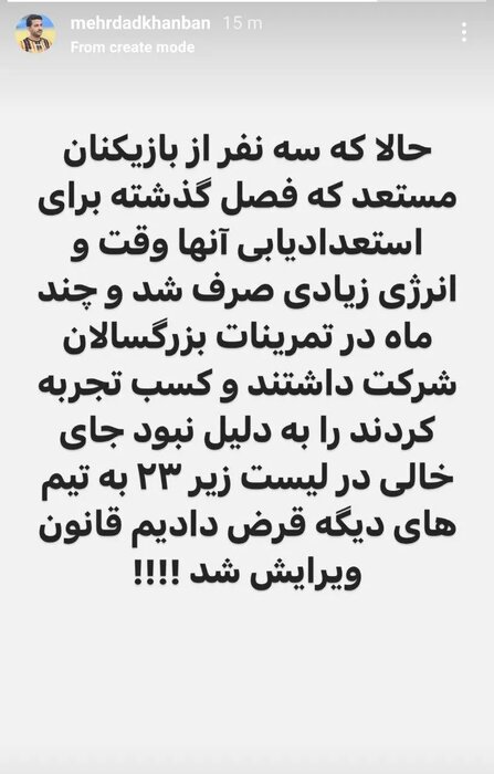 حالا که سه نفر از بازیکنان مستعد فصل گذشته که برای استعدادیابی آنها وقت و انرژی زیادی صرف شد و چند ماه در تمرینات بزرگسالان شرکت داشتند و کسب تجربه کردند، بهدلیل نبود جای خالی در لیست زیر ۲۳ سال، به تیمهای دیگر قرض دادیم، قانون ویرایش شد!