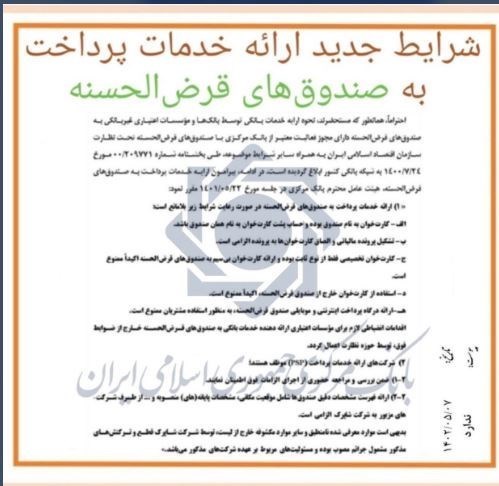 برهمین اساس و طبق بند یک این بخشنامه ارائه خدمات پرداخت به صندوق‌های قرض الحسنه در صورت رعایت شرایط زیر بلامانع است.