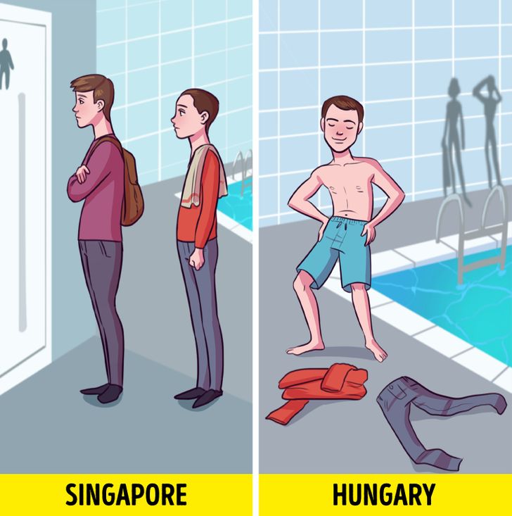 – برخی کشورها رویکرد ملایم تری نسبت به این مسأله دارند. مجارستان به فرهنگ شنایش مشهور است و این کشور مملوء از اسپا است. نه تنها تعویض لباس در ملأعام امری عادی تلقی می شود، بلکه در این کشور اسپاهایی وجود دارد که در آن ها پوشیدن مایو برای مشتریان ممنوع است چون آن را مانع بهره بردن از تأثیرات مثبت اسپا می دانند.