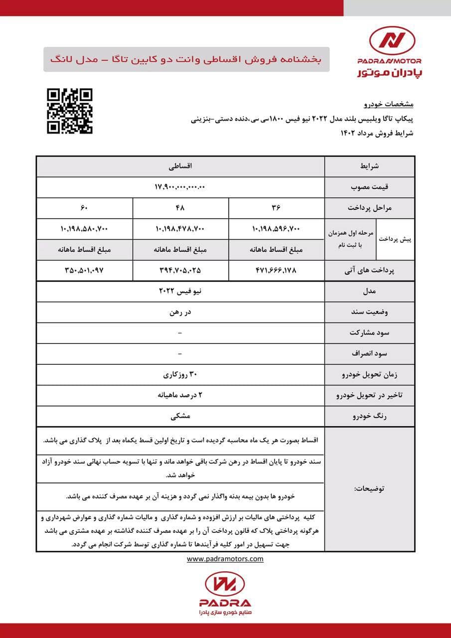 پادران موتور در این طرح نسخه استاندارد پیکاپ کینگ لینگ تاگا را با قیمت ۱ میلیارد و ۶۹۰ میلیون تومان و نسخه بلند آن را با قیمت ۱ میلیارد و ۷۹۰ میلیون تومان به شکل اقساطی در مدل نیوفیس ۲۰۲۲ به مشتریان عرضه می‌کند. مشتریان می‌توانند این پیکاپ را با اقساط ۳۶ ماهه، ۴۸ ماهه و ۶۰ ماهه خریداری کنند. در این طرح موعد تحویل ۹۰ روز کاری اعلام شده و سند خودرو نیز تا زمان تسویه کامل در رهن شرکت قرار خواهد داشت.
