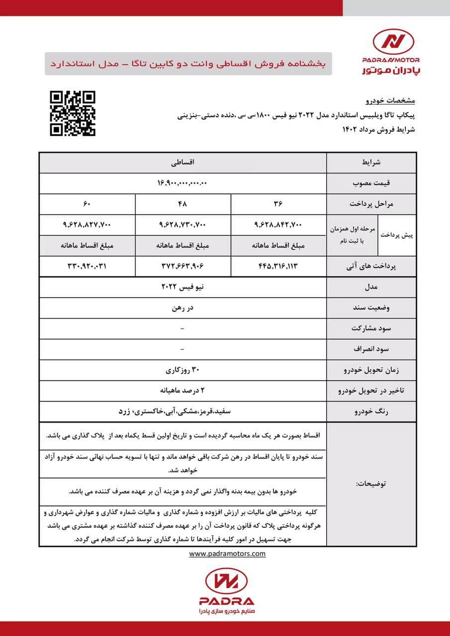 شرکت پادران موتور قصد دارد پیکاپ جدید تاگا را در دو نسخه نسخه استاندارد و لانگ به صورت اقساطی ویژه مرداد ۱۴۰۲ به بازار عرضه کند. مشتریان برای کسب اطلاعات بیشتر و ثبت نام باید با نمایندگی‌های پادران موتور تماس بگیرند. در ادامه جزئیات شرایط فروش پیکاپ تاگا در مرداد ماه را مشاهده می‌کنید: