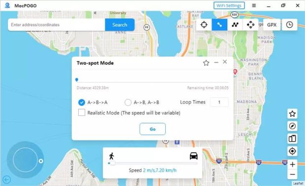 در مرحله دوم میتوانید سرعت و زمان رسیدن به مقصد را تعریف کنید و دوباره با کلیک روی Go، موقعیت مکانی خود را تغییر بدهید.