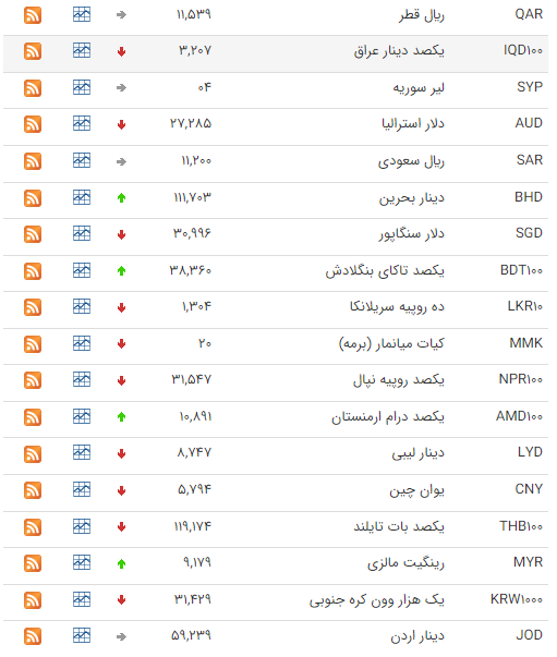 هر لیر ترکیه هم ۱۵ هزار و ۱۳۸ ریال خرید و ۱۵ هزار و ۲۷۵ ریال فروخته شد. هر یوان چین هم ۵۶ هزار و ۴۸۹ ریال خرید و ۵۷ هزار و ۲ ریال فروخته شد.