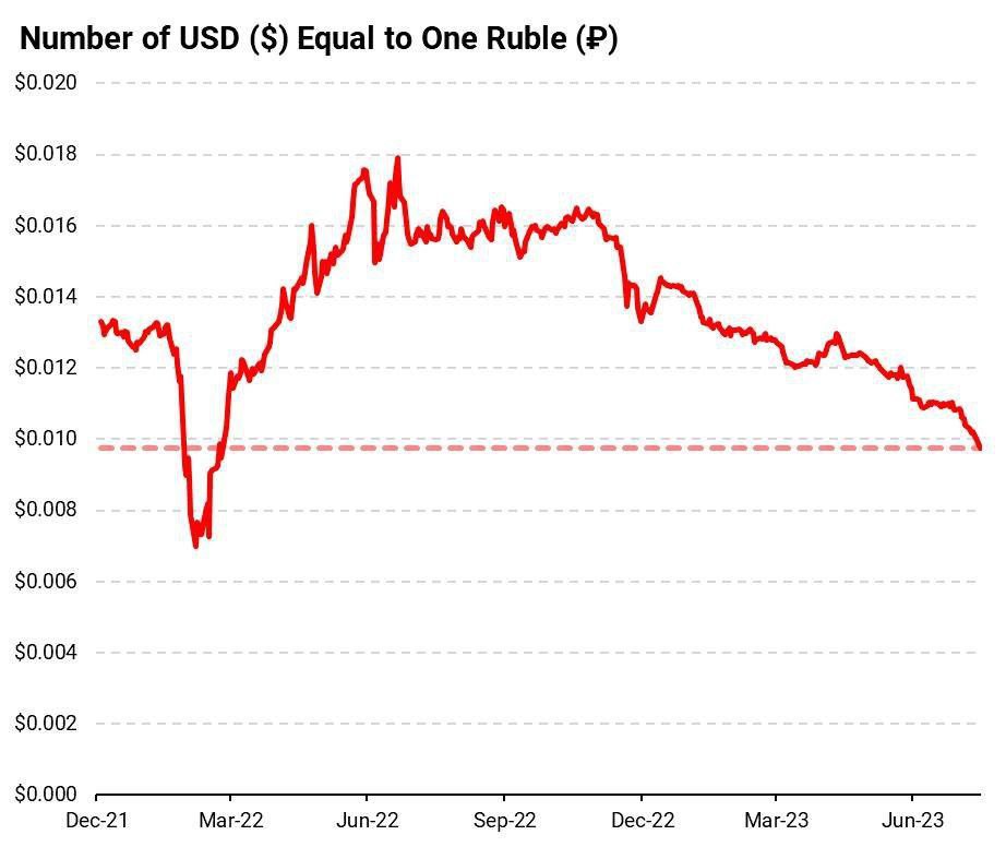 بهطور کلی از ابتدای سال 2023 تاکنون، ارزش روبل روسیه بیش از 25 درصد افت کرده و باعث شده تا بخشی از افزایش ارزش این ارز در سال 2022 به خاطر افزایش درآمدهای نفتی و گازی روسیه از بین برود.