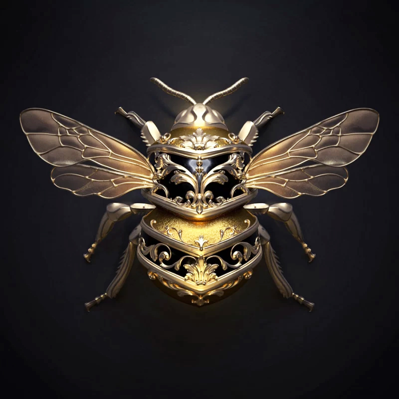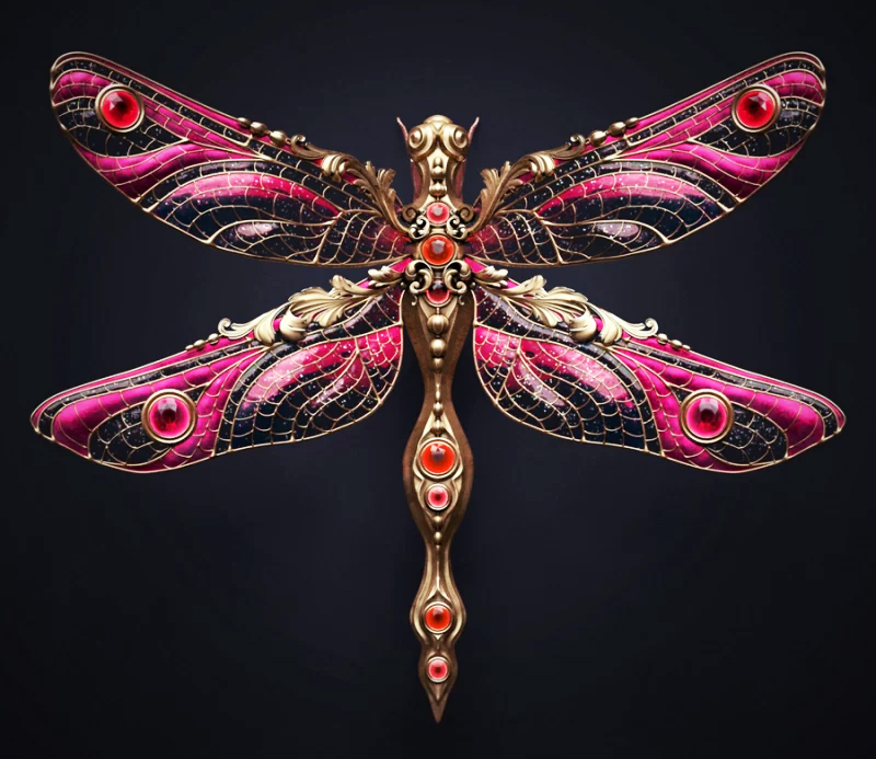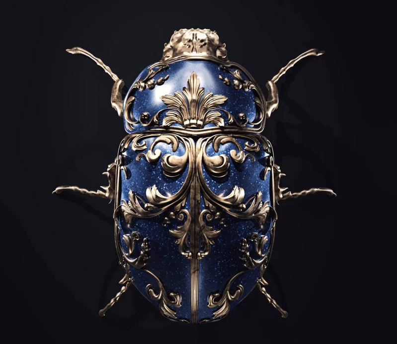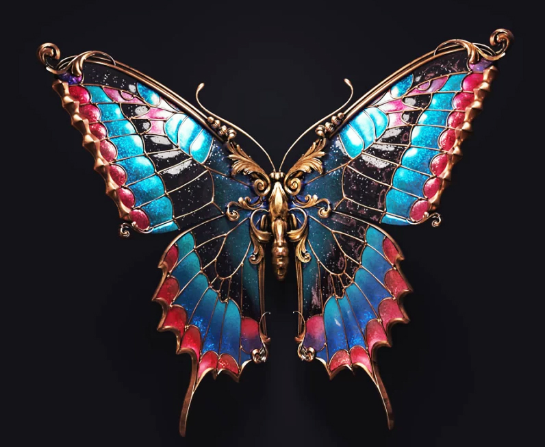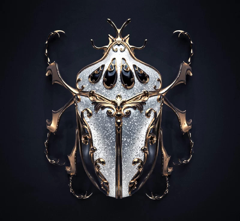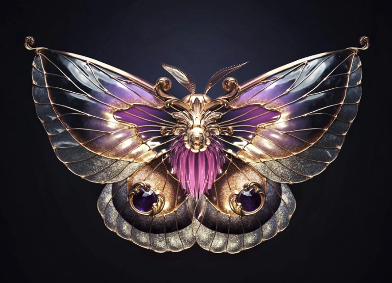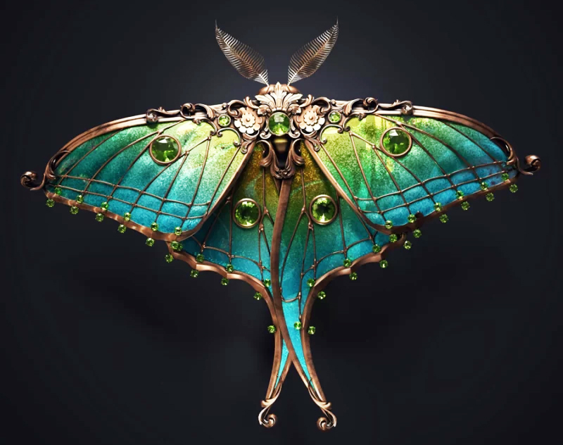 این حشرات به شکل مجسمه‌ای برای تداعی یک سنجاق سینه یا دیگر آثار هنری پوشیدنی، جواهرات و بخش‌های پر جنب و جوش و رنگین کمانی بدن را در ساختاری فلزی می‌پوشانند. نقوش متقارن بال‌ها و صدف‌ها را زینت می‌دهند و لایه‌ای از تزیینات را به موضوع طبیعی اضافه می‌کنند.