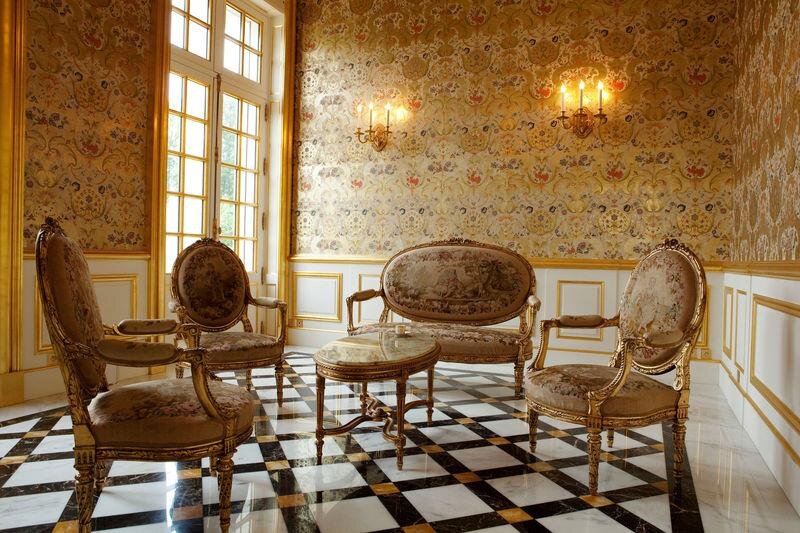 یکی از جاذبههای این قصر تنوع سنگهای بکار گرفته شده در ساخت آن است؛ Black Saint-Laurent: Hérault فرانسوی، یلو سینا، ایتالیا، سبز عتیقه، ایتالیا، قرمز گیلاسی، بلژیک، سنگ مرمر Collemandina، ایتالیا، مرمر سالومه، ترکیه، مرمر لوانته قرمز، ایتالیا، کوارزیت ماکائوبا، برزیل، پینک آلپینینا، پرتغال، سنگ ماه، برزیل، عقیق صورتی، ایران، Rouge de France: Hérault، فرانسه، کالاکاتا توپازیو، ایتالیا و سبز بامبو، برزیل