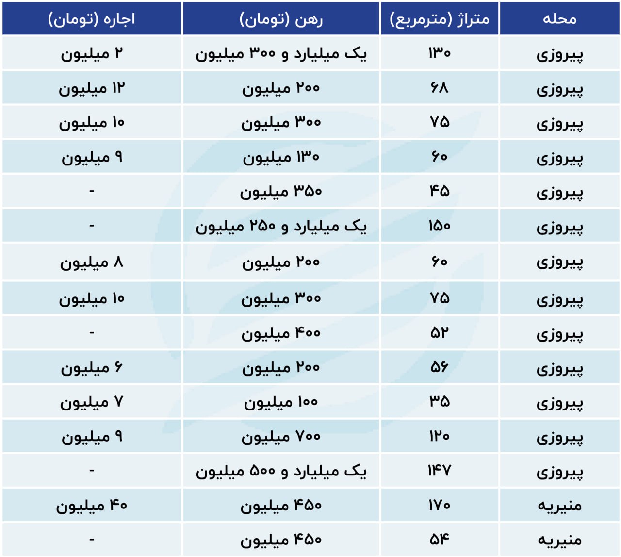 در محله پیروزی، برای واحدی با 60 مترمربع زیربنا، 130 میلیون تومان رهن و 9 میلیون تومان اجاره و آپارتمانی دیگر با 75 مترمربع زیربنا، 300 میلیون تومان رهن و 10 میلیون تومان اجاره ماهانه پیشنهاد شده است.