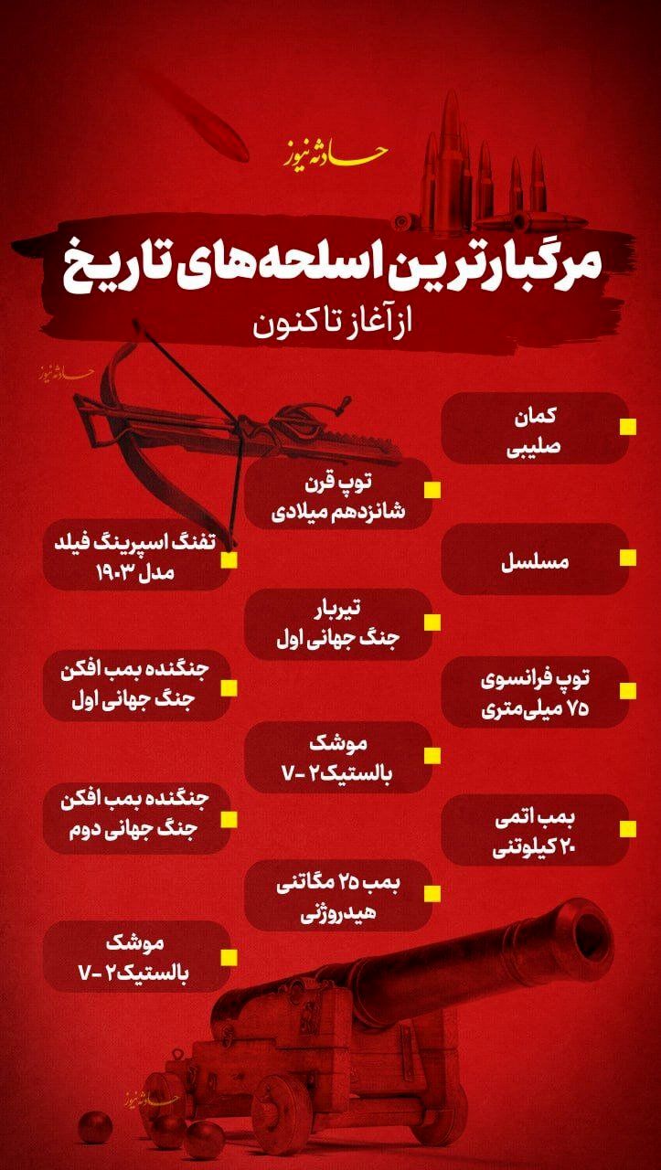 ۱۲ تا از مرگبارترین اسلحههای تاریخ از آغاز تا کنون را در اینفوگرافی زیر ببینید.