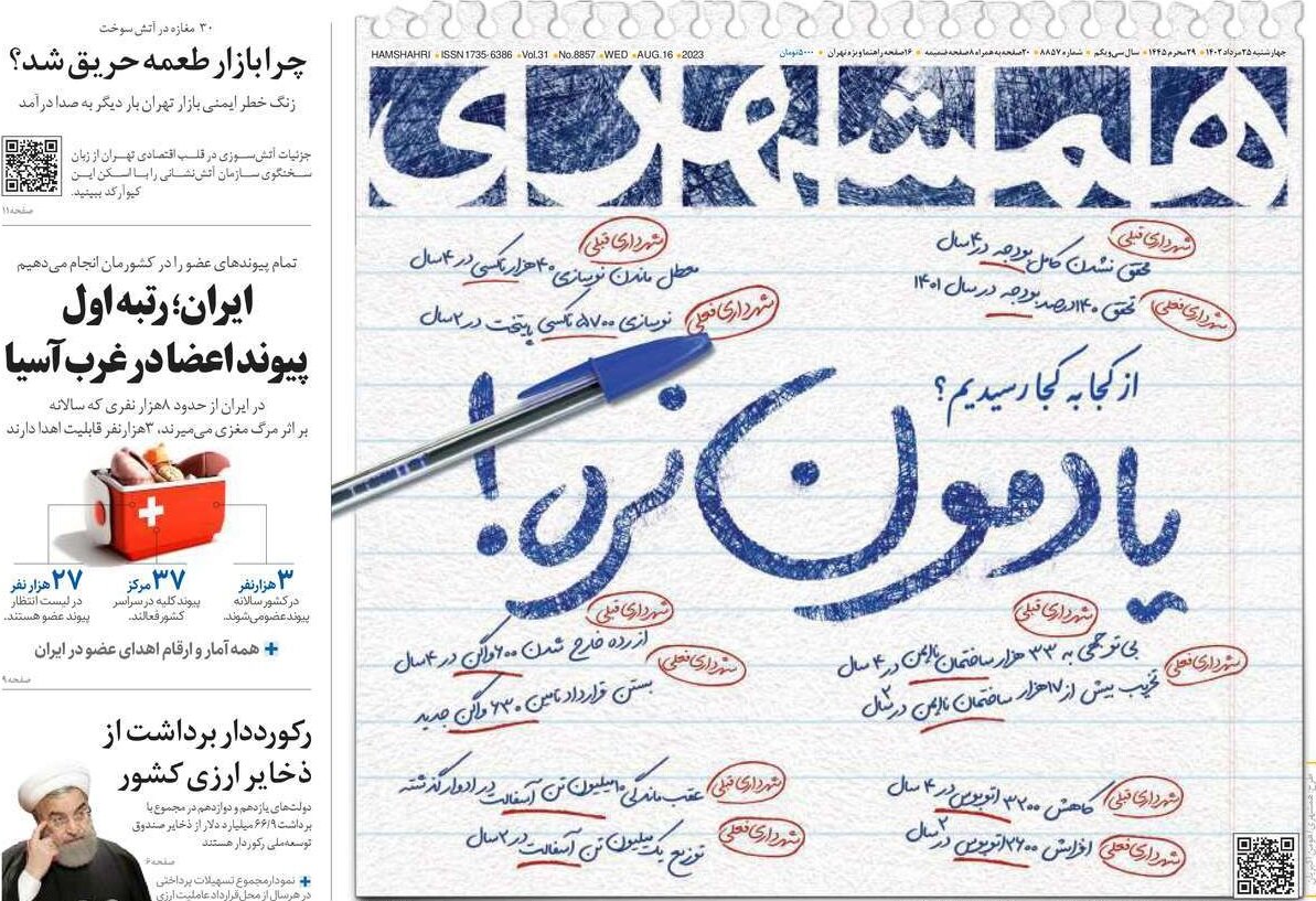 روزنامه همشهری، ارگان رسانهای شهرداری تهران در تصویر روی جلد امروزِ خود، با ارائه آماری به مقایسه دوران حناچی و زاکانی پرداخت و با عبارت «یادمون نره» به نوعی انتقادات از این دوره شهرداری تهران را غیر موجه دانست.