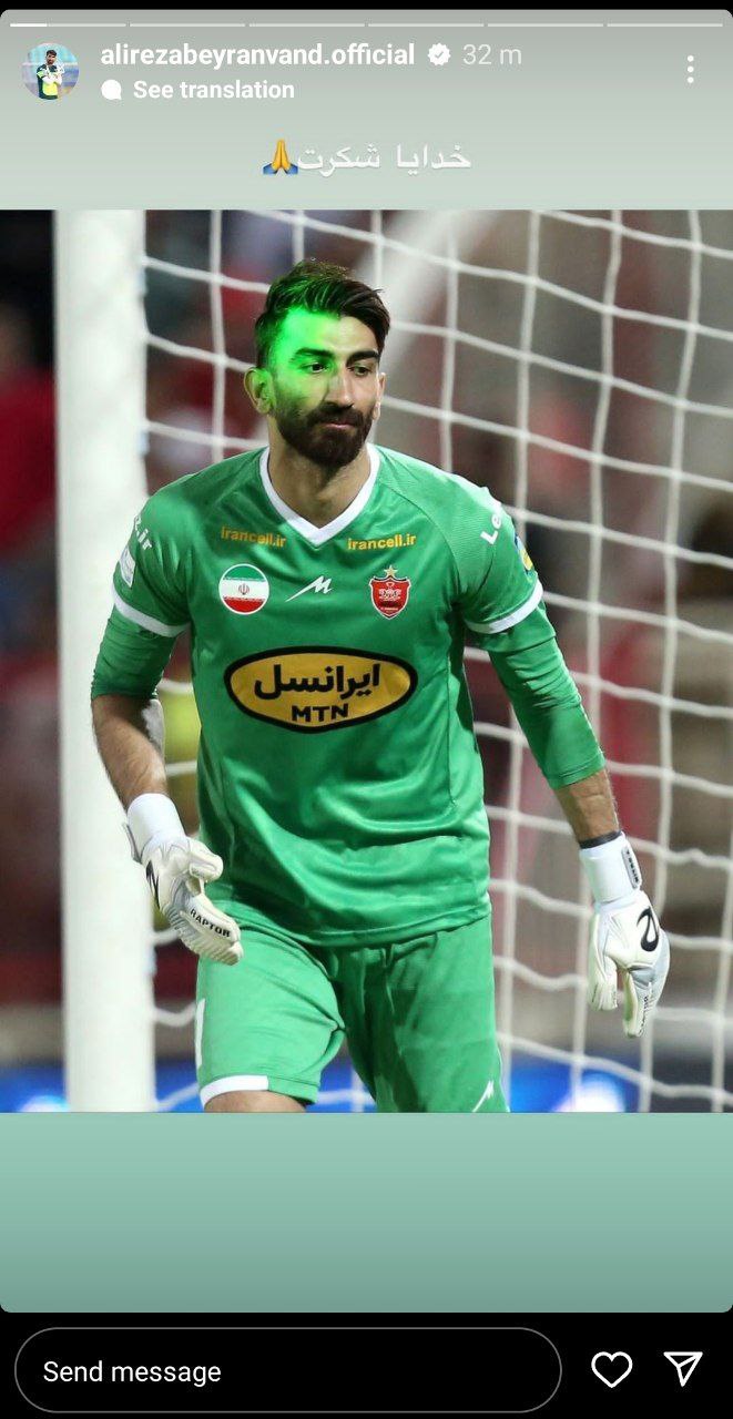 در این تصویر روی چشم بیرانوند لیزر انداخته شده و او با استوری کردن آن به نوعی به هوادار تراکتور هم کنایه زده است.
