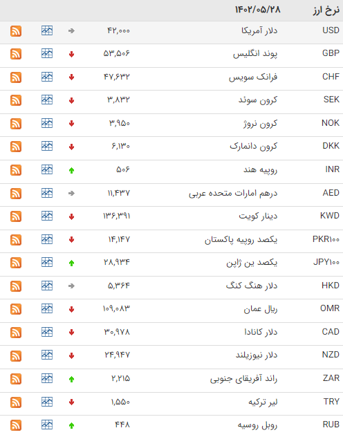 بانک مرکزی امروز نرخ هر دلار را ۴۲ هزار ریال، پوند را ۵۳ هزار و ۵۰۶ ریال و یورو را ۴۵ هزار و ۶۷۳ ریال اعلام کرد.
