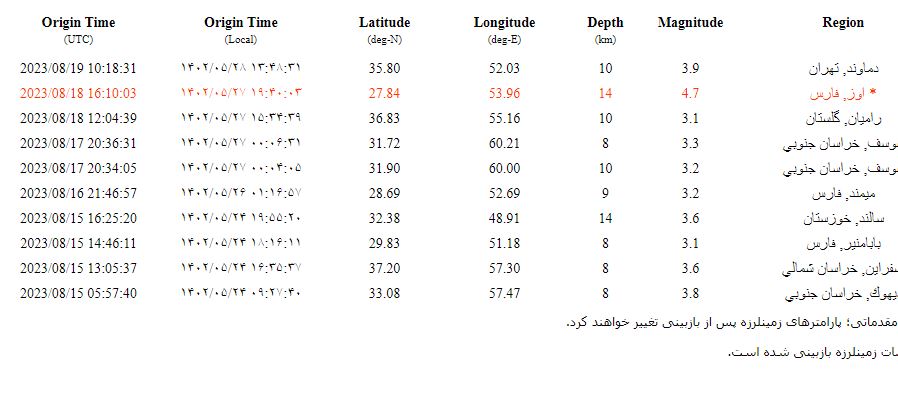به گزارش سایت طلا،شبکههای لرزهنگاری مرکز لرزهنگاری کشوری مؤسسه ژئوفیزیک دانشگاه تهران در ساعت ۱۳:۴۸:۳۱ روز شنبه ۲۸ مردادماه این زمینلرزه را ثبت کردند.