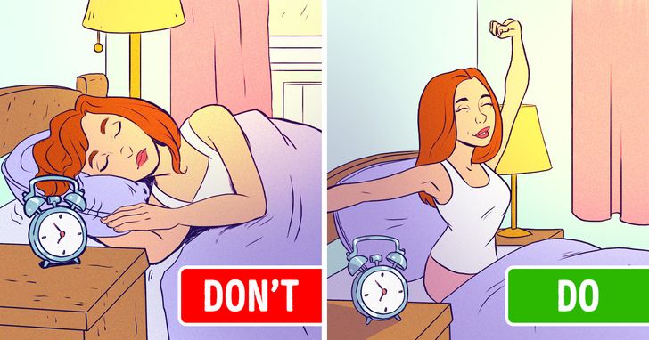 در برابر وسوسه ی قطع زنگ ساعت و به تعویق انداختن زمان بیدار شدن تان مقاومت کنید. این امر صرفاً برای استفاده ی بیشتر از وقت خود نیست، بلکه قطع کردن زنگ ساعت و برگشتن به خواب باعث چند پاره شدن خواب می شود. به همین دلیل طی روز احساس خستگی خواهید کرد.