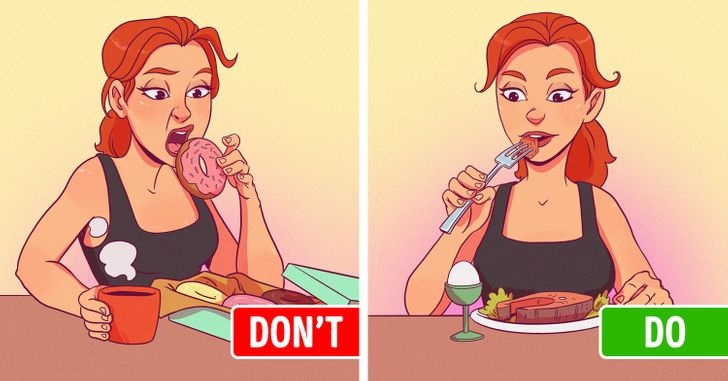 صبح ها بعد از بیدار شدن از خواب ممکن است وسوسه شوید صبحانه را از قلم بیاندازید تا زمان بیشتری برای بقیه ی کارهای خود داشته باشید، اما حقیقت این است که بدن ما انرژی خود را از مواد غذایی می گیرد، بنابراین باید حتماً چیزی بخوریم. صبحانه باید چیز سالمی مانند غلات کامل یا مواد پروتئینی باشد.
