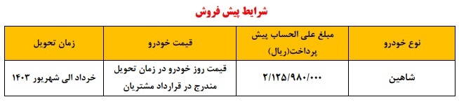 شرایط طرح جدید پیش فروش خودروی شاهین مرداد 1402 اعلام شد.