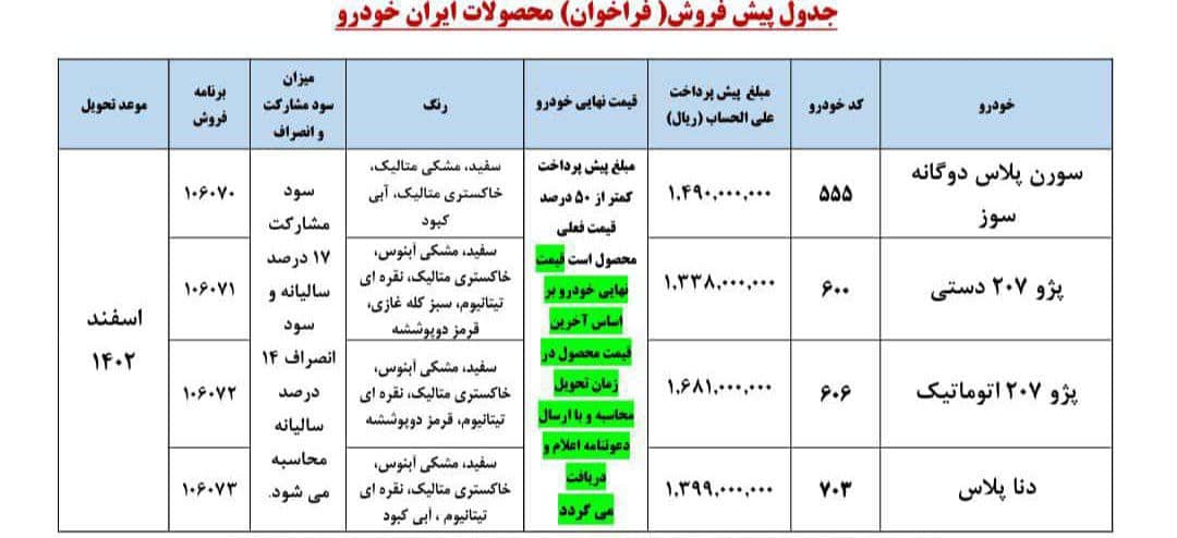 در این طرح سورن پلاس دوگانه سوز با پیشپرداخت ۱۴۹ میلیون تومان، پژو ۲۰۷ دستی با پیشپرداخت ۱۳۳ میلیون و ۸۰۰ هزار تومان، پژو ۲۰۷ اتوماتیک با پیشپرداخت ۱۶۸ میلیون و ۱۰۰ هزار تومان و دنا پلاس با پیشپرداخت ۱۳۹ میلیون و ۹۰۰ هزار تومان به شکل پیش فروش به مشتریان عرضه میشوند. در این طرح موعد تحویل خودروها اسفند ۱۴۰۲ اعلام شده است.