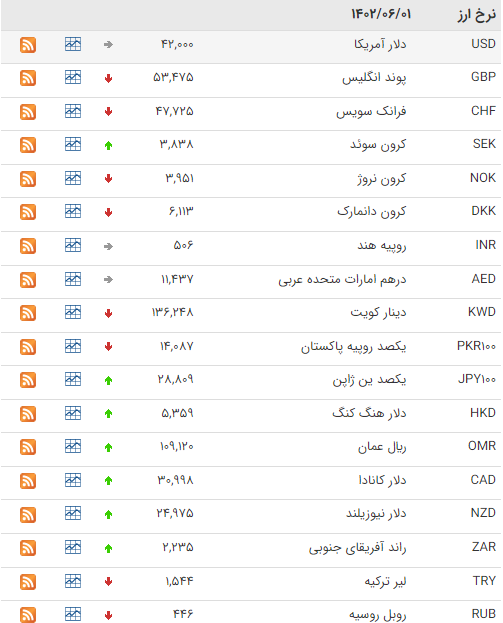 بانک مرکزی امروز، چهارشنبه اول شهریور ۱۴۰۲، نرخ رسمی ۴۶ ارز را اعلام کرد که بر اساس آن نرخ ۲۲ ارز افزایش و نرخ ۱۵ ارز کاهش یافت، نرخ باقی ارزها ثابت ماند.
