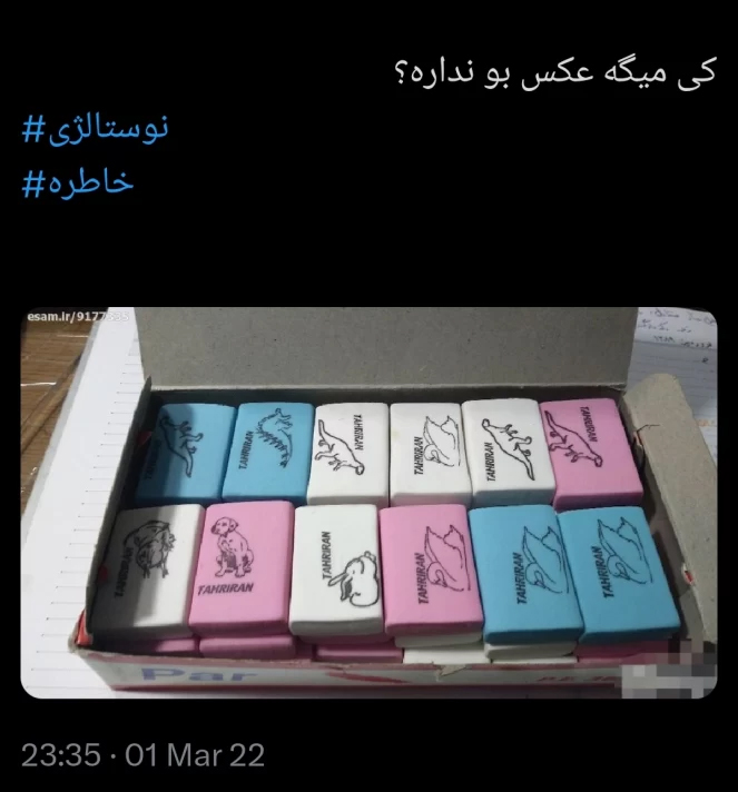بعضی عکس ها واقعا بو دارند مثل پاک کن های عطری دهه شصت یا ویفر موزی های قدیمی یادتونه؟؟ چه دورانی بود ها یادش بخیر... بعضی از کاربران توییتر با این عنوان تصاویری را به اشتراک گذاشتند...