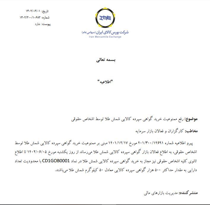 براساس اطلاعیه مدیریت بازارهای مالی بورس کالای ایران، پیرو اطلاعیه شماره ۴۰۱٫۳۰۰٫۱۴۶۹۱ مورخ ۱۴۰۱٫۱۲٫۱۷ مبنی بر ممنوعیت خرید گواهی سپرده کالایی شمش طلا توسط اشخاص حقوقی به اطلاع فعالان بازار گواهی سپرده کالایی شمش طلا میرساند، از روز یکشنبه مورخ ۱۴۰۲٫۰۶٫۰۵ تا اطلاع ثانوی کلیه اشخاص حقوقی نیز مجاز به خرید گواهی سپرده کالایی شمش طلا در نماد CD۱GOB۰۰۰۱ با محدودیت تعداد دارایی به مقدار حداکثر ۵۰۰ هزار گواهی سپرده کالایی معادل ۵۰ کیلوگرم شمش طلا هستند.
