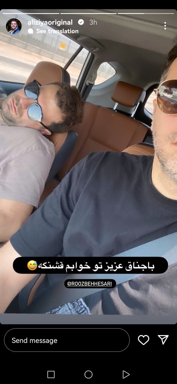 علی ضیا با انتشار عکسی از دوستش در ماشین نوشت: باجناق عزیز تو خوابم قشنگه.