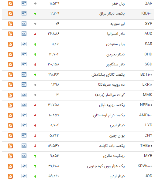 هر لیر ترکیه هم ۱۵ هزار و ۴۱۷ ریال خرید و ۱۵ هزار و ۵۵۷ ریال فروخته شد. هر یوان چین هم ۵۶ هزار و ۱۵۳ ریال خرید و ۵۶ هزار و ۶۶۳ ریال فروخته شد.