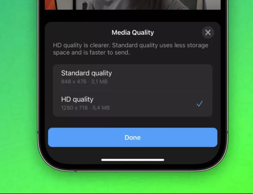 با انتخاب گزینه استاندارد، واتساپ ویدیو شما را با وضوح 480p فشرده و ارسال میکند. اما با گزینه کیفیت HD، ویدیوها با وضوح 720p ارسال میشوند که هرچند همچنان از 1080p یا 4K کیفیت کمتری دارند، اما بسیار قابلقبولتر است.