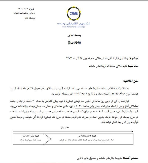 به گزارش سایت طلا،در متن این اطلاعیه آمده است: به اطلاع کلیه فعالان معاملات قراردادهای مشتقه میرساند قرارداد آتی شمش طلای خام تحویل ۲۸ آذر ماه ۱۴۰۲ از روز دوشنبه مورخ ۱۴۰۲٫۰۶٫۰۶ راه اندازی شده و تا تاریخ ۱۴۰۲٫۰۹٫۲۸ قابل معامله خواهد بود.