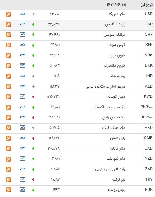 بانک مرکزی امروز، یکشنبه ۵ شهریور ۱۴۰۲، نرخ رسمی ۴۶ ارز را اعلام کرد که بر اساس آن نرخ ۲۳ ارز افزایش و نرخ ۱۵ ارز کاهش یافت، نرخ باقی ارزها ثابت ماند.