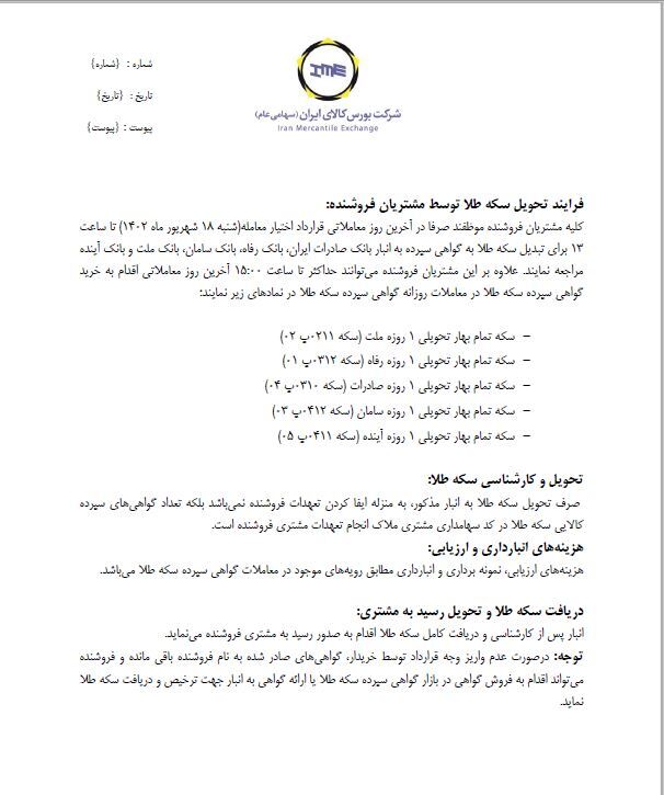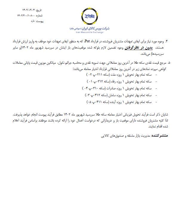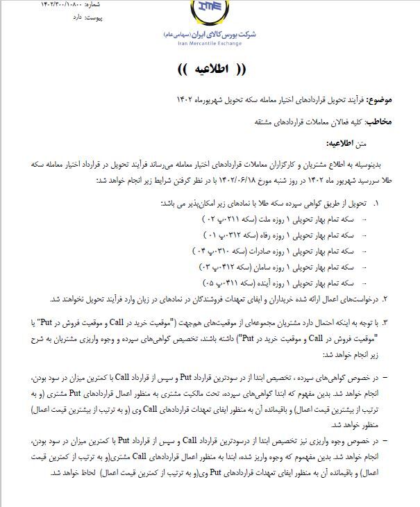 شایان ذکر است فرآیند تحویل فیزیکی اختیار معامله سکه طلا سررسید شهریور ماه ۱۴۰۲ مطابق فرآیند پیوست انجام خواهد پذیرفت؛ لذا کلیه مشتریان فروشنده دارای موقعیت باز و خریدارانی که درخواست اعمال خود را ارائه کرده باشند موظفند براساس فرآیند اعلام شده اقدام نمایند.