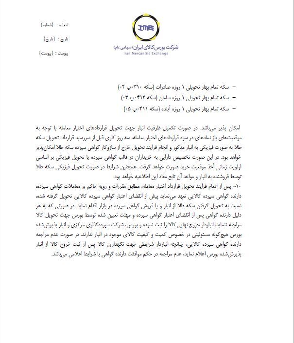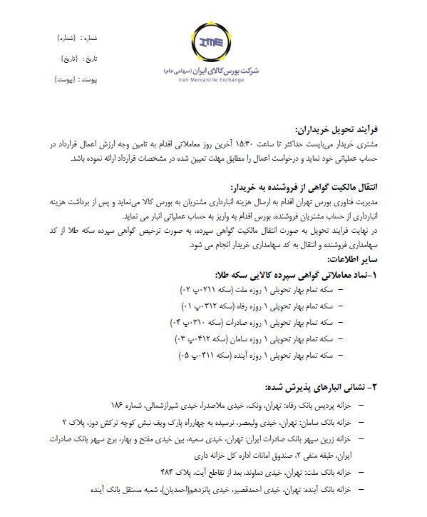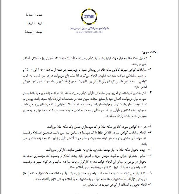 ۱ - تحویل سکه طلا به انبار جهت تبدیل شدن به گواهی سپرده حداکثر تا ساعت ۱۳ آخرین روز معاملاتی امکان پذیر میباشد.