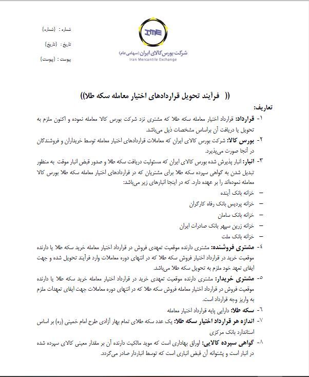 ۱ قرارداد قرارداد اختیار معامله سکه طلا که مشتری نزد شرکت بورس کالا معامله نموده و اکنون ملزم به مشتری فروشنده مشتری دارنده موقعیت تعهدی فروش در قرارداد اختیار معامله خرید سکه طلا یا دارنده موقعیت خرید در قرارداد اختیار فروش سکه طلا که در انتهای دوره معاملات وارد فرآیند تحویل شده و جهت گواهی سپرده کالایی اوراق بهاداری است که موید مالکیت دارنده آن بر مقدار معینی کالای سپرده شده